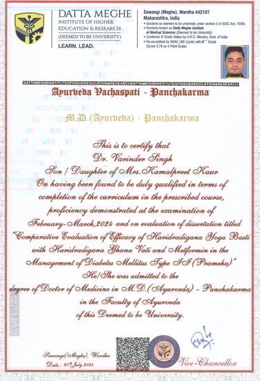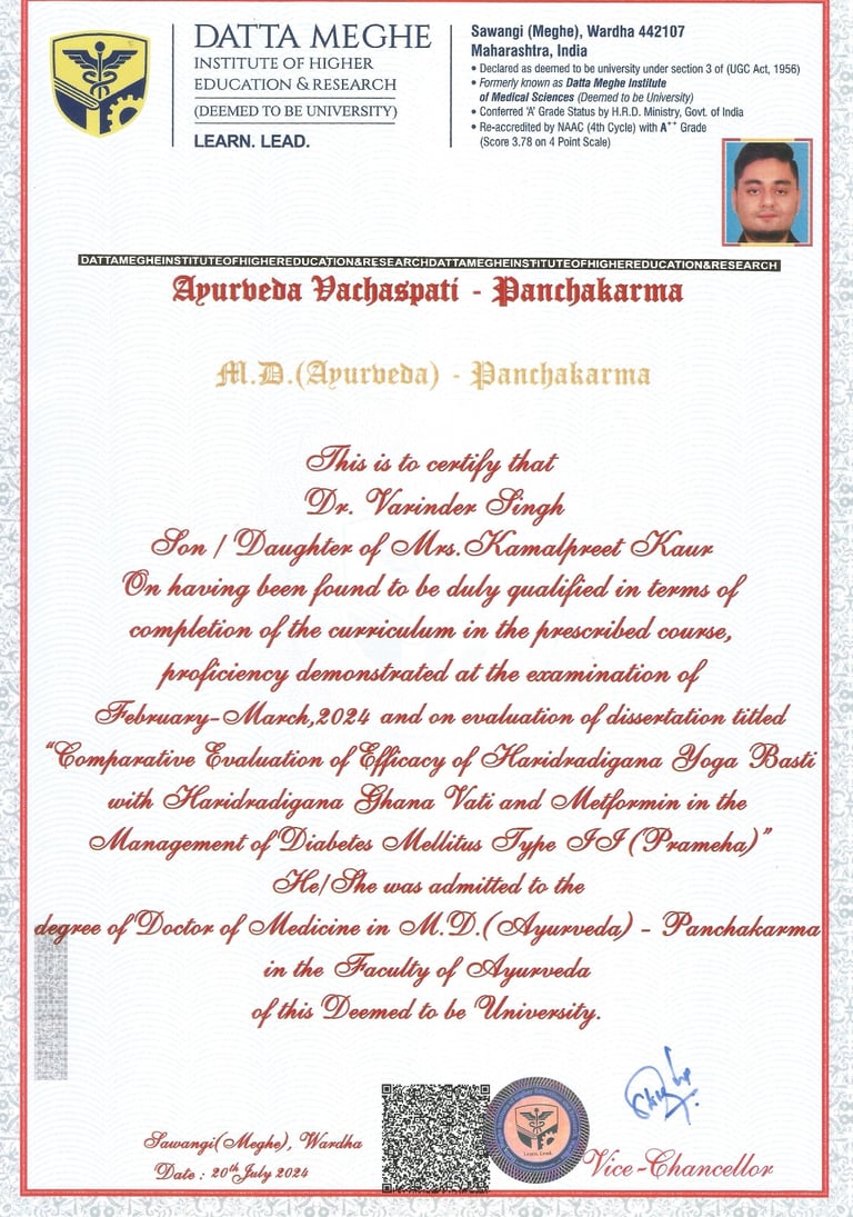 Obtained specialization degree MD in Panchakarma from prestigious Datta Meghe Institute of Higher Education & Research, Wardha, Maharashtra