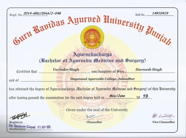 Dr. Varinder Singh specializes in Ayurveda, offering holistic treatments for wellness.